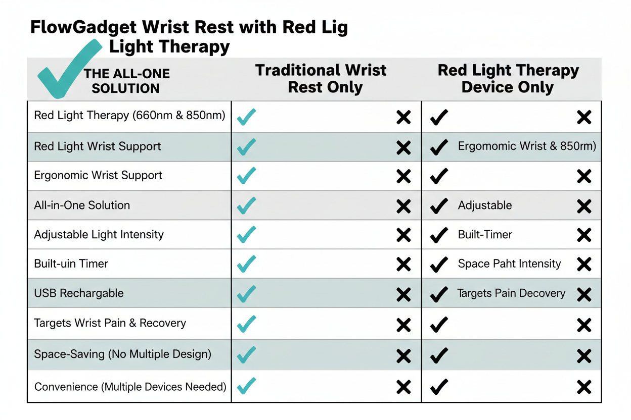 The Flow Gadget Therapeutic Wrist Rest isn't just an accessory: it's the only active defense against wear and tear. Our red light therapy (660nm + 850nm) works for you while you work, healing your tendons deeply.